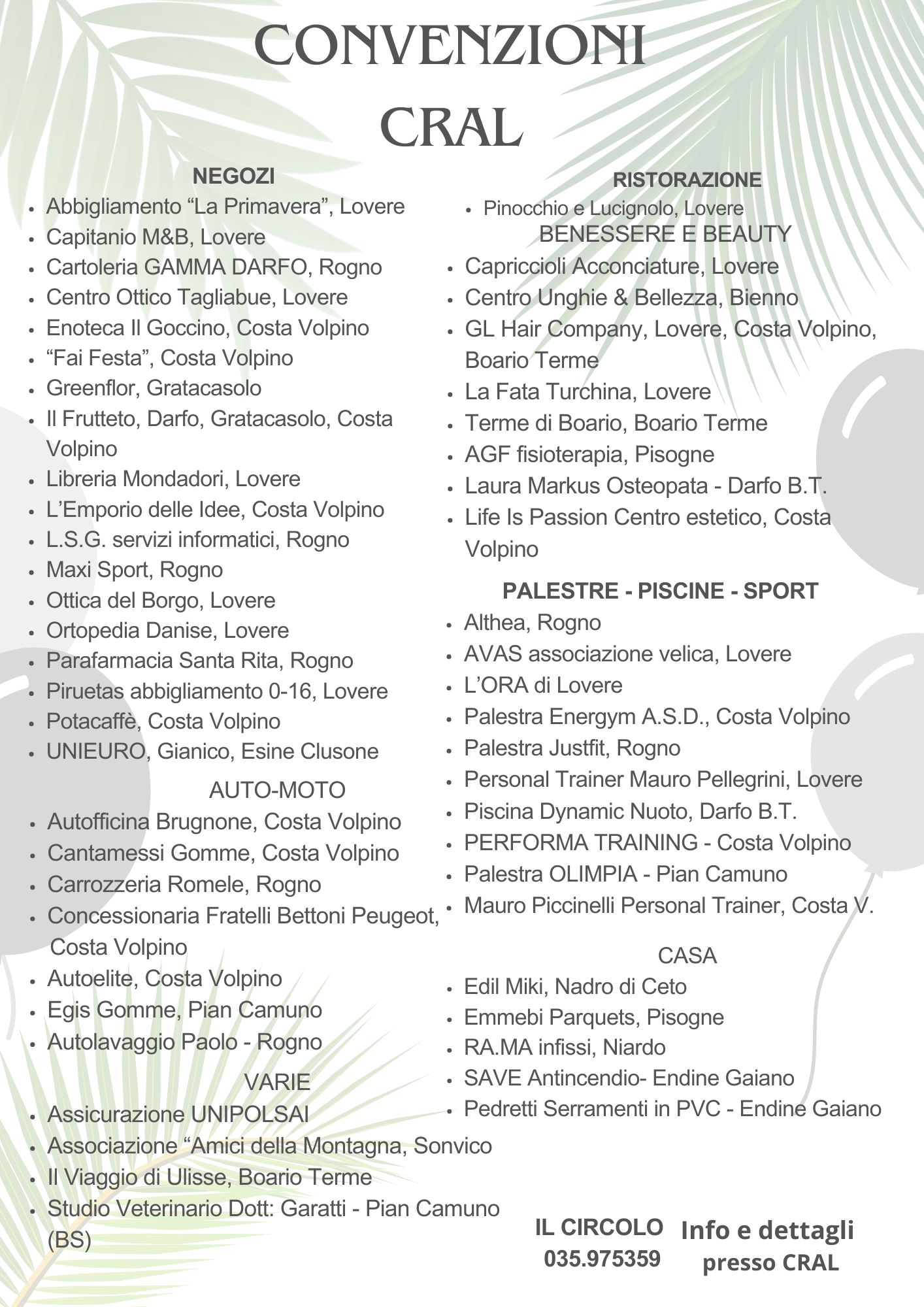 I dati personali da Lei inseriti, sono trattati dal proprietario del sito CRAL AZIENDALE COSTA VOLPINO - Via Piò, 30 - 24062 - Costa Volpino (BG) in qualità di Titolare, per finalità connesse alla fornitura dei servizi da Lei richiesti (a titolo esemplificativo: richiedere informazioni, registrarsi al sito per ricevere vantaggi e offerte, ottenere preventivi, effettuare pagamenti, acquistare beni e riceverli presso un domicilio da Lei indicato, effettuare una prenotazione, scambiare documenti).